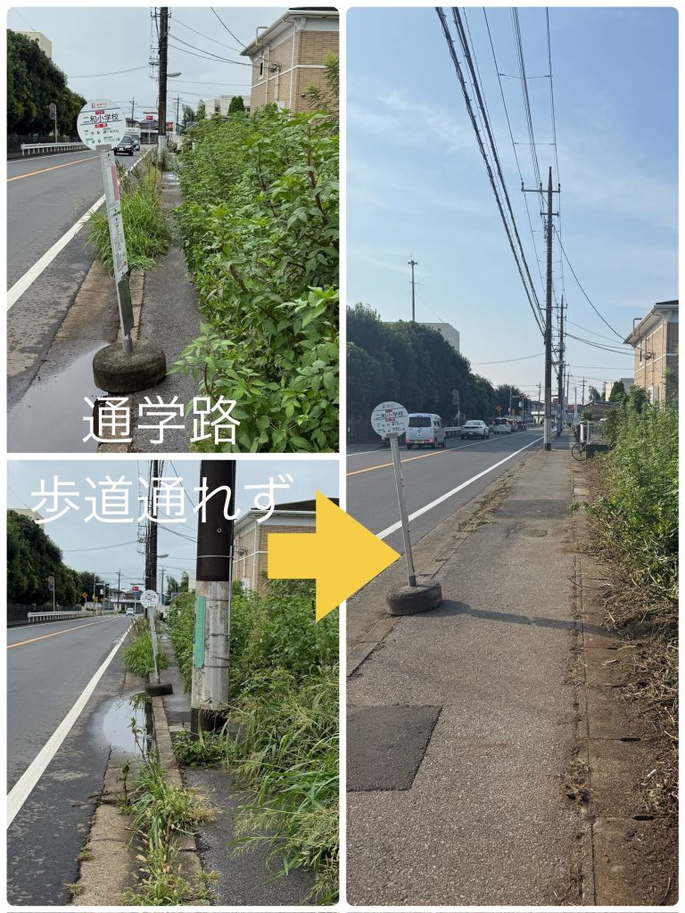 この陽気、時々の雨も加わり雑草がすごいです。先日も、二和小学校前のバス停の繁茂がものすごく、道路を歩くような状況で危険。「歩道の整備」はアスファルトだけではなく、除草も大事。地域からの声を受けて、市→葛南に除草をお願いすると、すぐに対応して頂きました。気づかれた場所がありましたら、お知らせください。