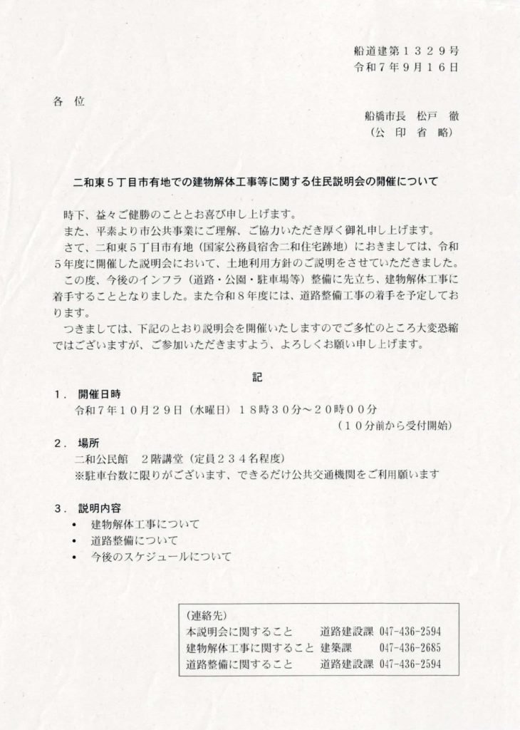 - 解体工事始まることに伴い、住民説明会が開催されます。10月29日(水)18時半~20時@二和公民館