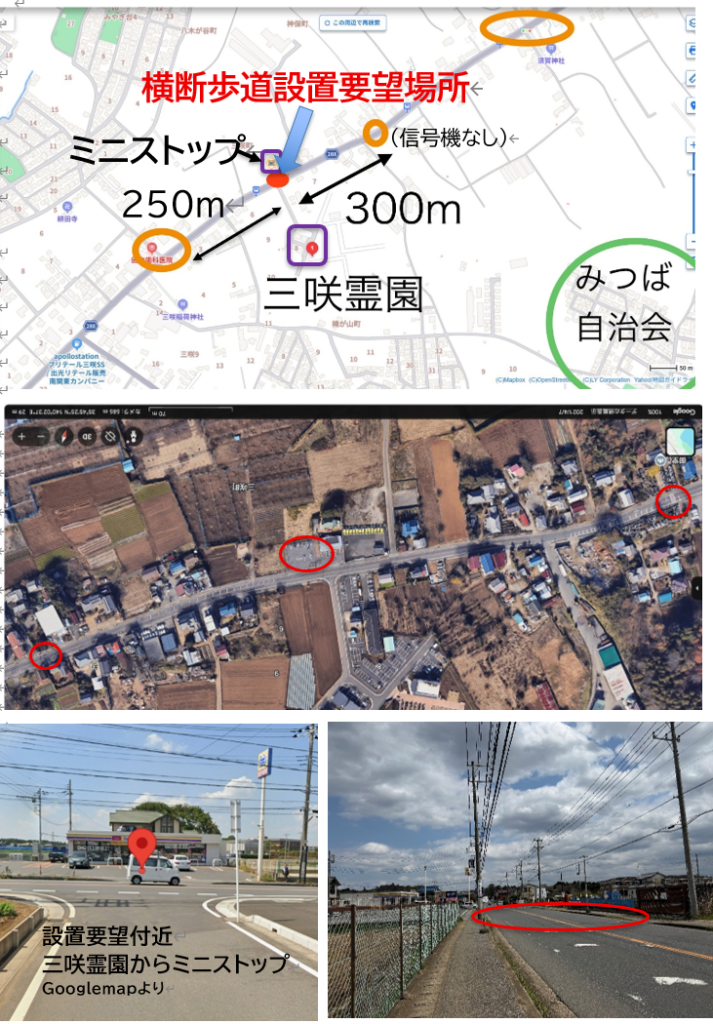 楠が山周辺は、近隣にスーパーがなく、徒歩でミニストップ(三咲町)を利用する方も多くいらっしゃいます。しかし、近年は県道夏見小室線の交通量が増え、大きなトラックがスピードを出していることもあります。ミニストップ側へはなかなか渡れないのが現状です。また、ミニストップ側からは、バス利用者や三咲霊園墓参者の横断があります。しかし、横断歩道は北・南どちらも約250m・300m離れており、横断歩道まで歩くことは高齢者には大変負担な状況です。 このような状況から、利用者の多いミニストップ前に横断歩道を要望する声が高まっていました。
