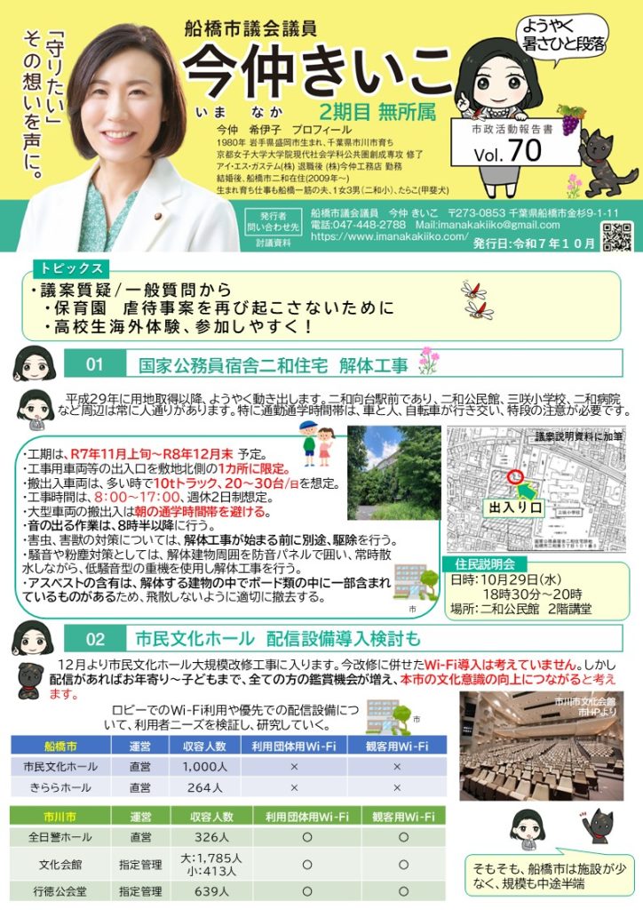 すっかり秋らしく、風が冷たい日も増えました。10月3日議会閉会、16日の総務委員会、10月末からは広島・長崎への視察が終わるとすぐにまた次定例会が開会となり、あっという間に年末になりそうです。